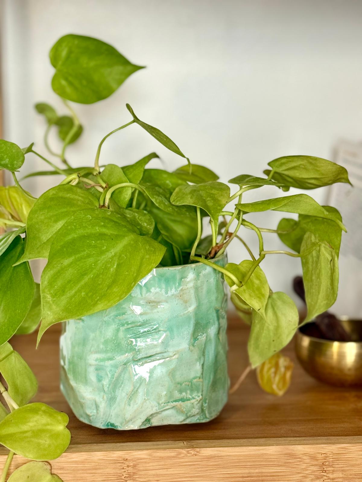 Le petit cache-pot Vert Minéral condense l’esprit brut et sculptural de sa version plus grande dans un format plus intime. Tourné puis façonné à la main selon la technique japonaise du kurinuki, il révèle des reliefs organiques qui captent la lumière et soulignent la trace du geste.