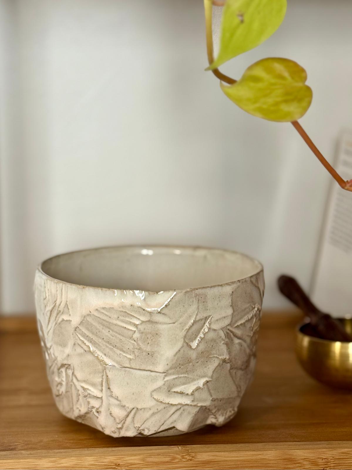 Cette pièce en grès allie finesse et caractère. Façonnée au tour puis creusée à la main selon la technique japonaise du kurinuki, elle dévoile des reliefs irréguliers qui lui donnent une allure sculpturale et singulière.