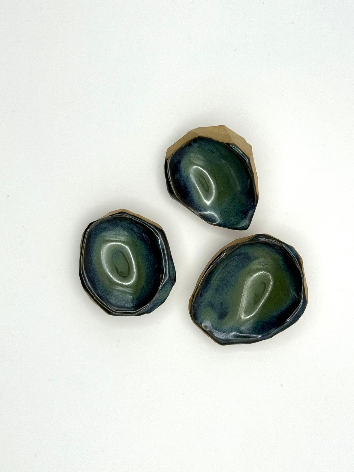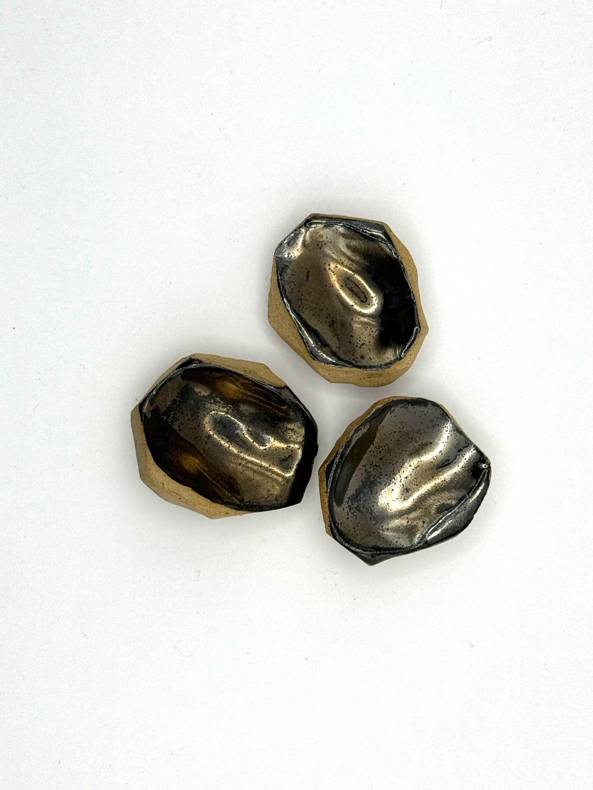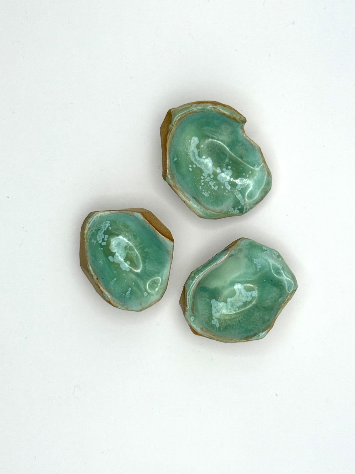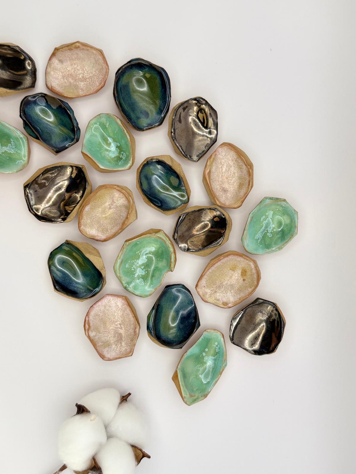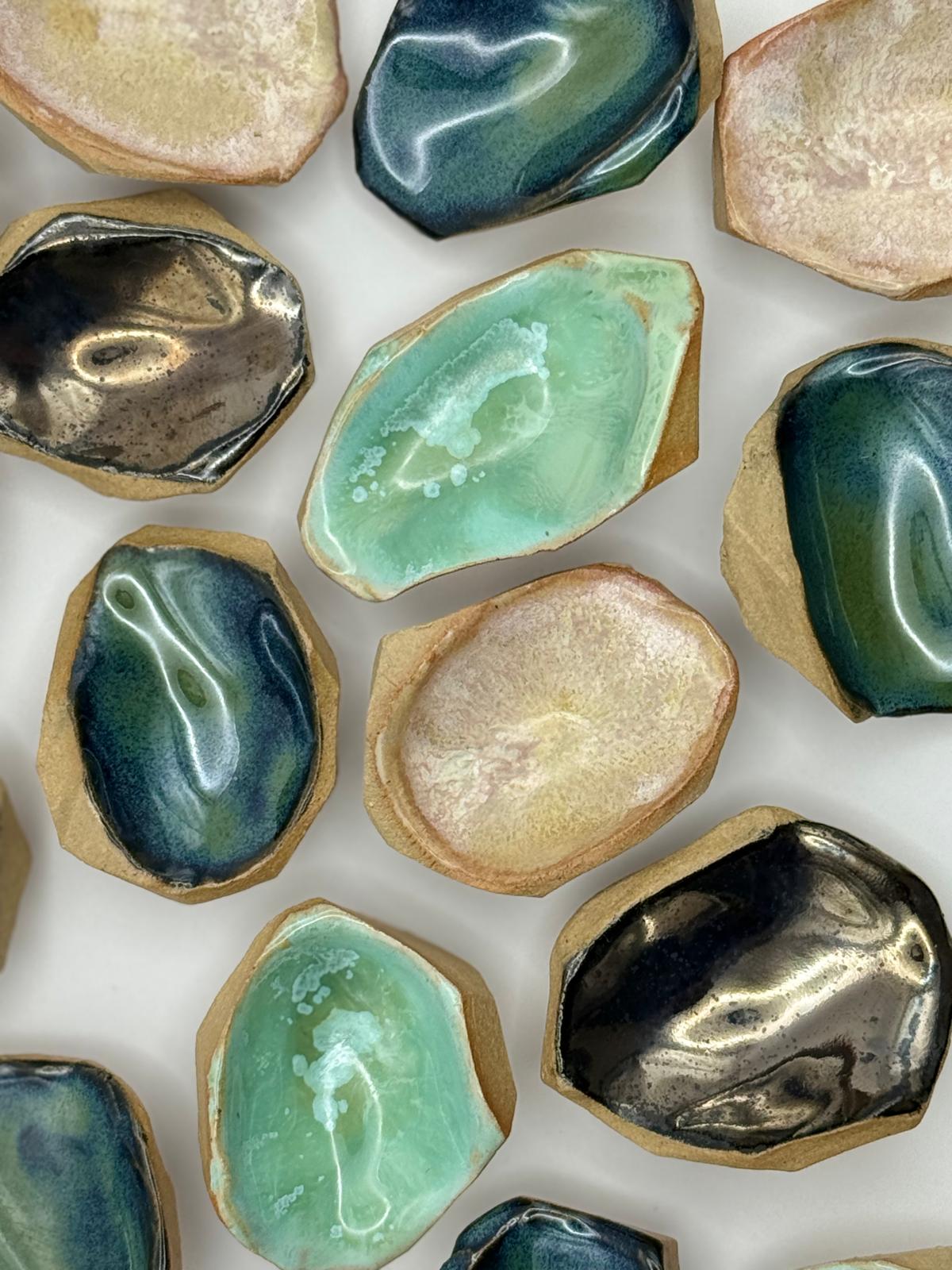 Chaque pièce est volontairement irrégulière : un face émaillée qui invite au glissement, plus ou moins lisse selon la couleur choisie, et un revers brut aux reliefs aléatoires.