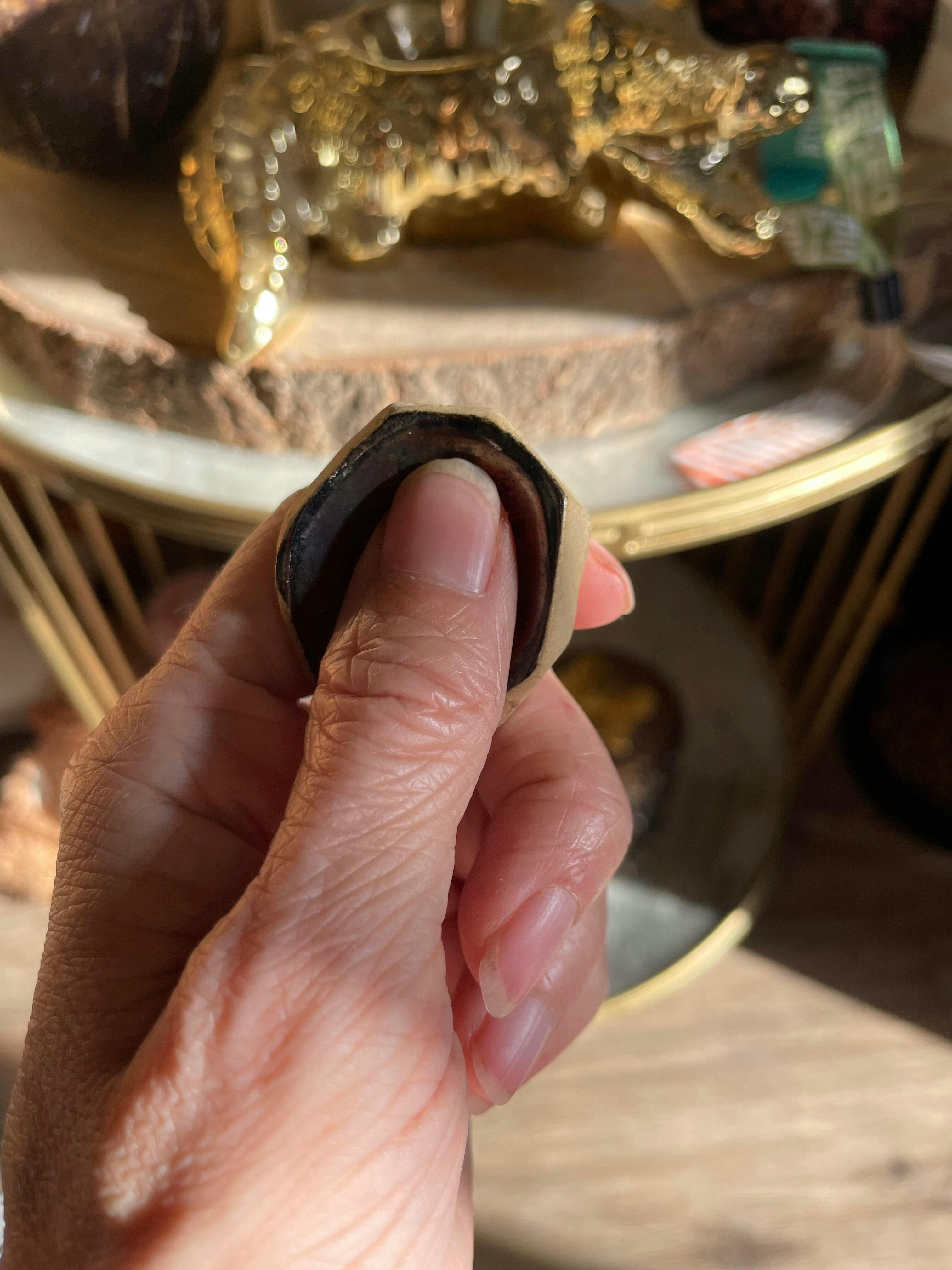 Une pierre en céramique façonnée à la main, à tenir entre le pouce et l'index pour accompagner un geste de lâcher prise.
